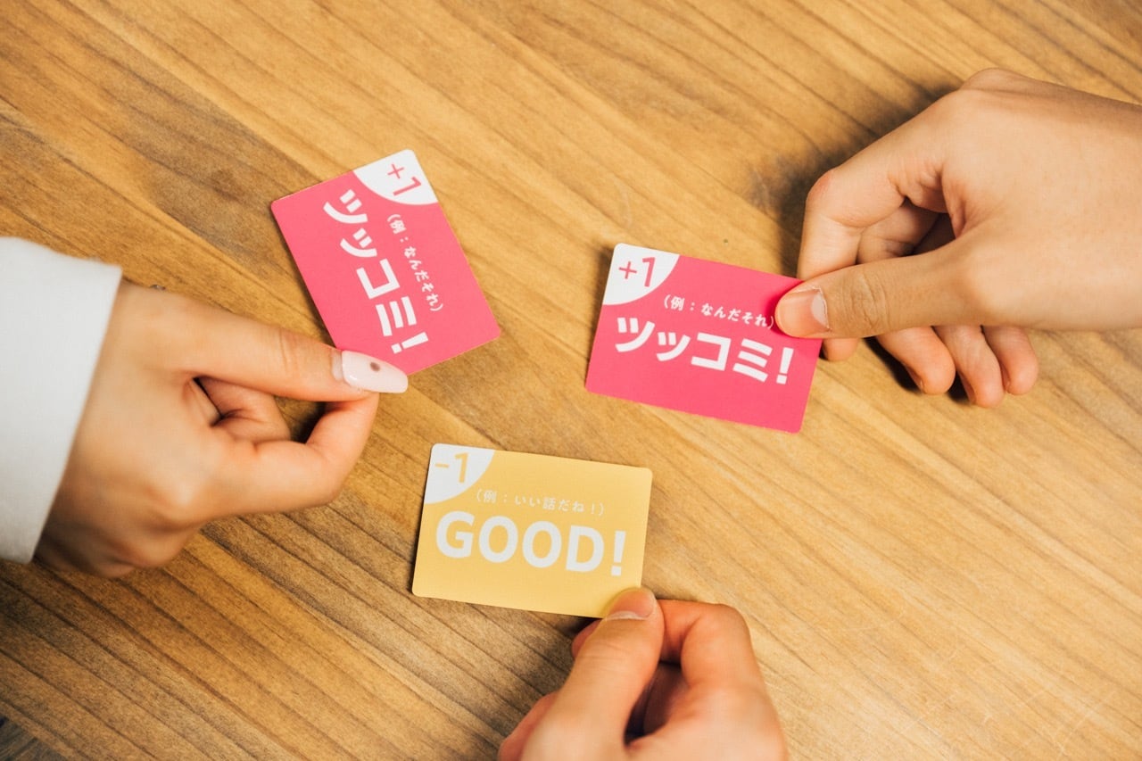 ④1人が話し終えるごとに相槌カードを1枚めくり、次のプレイヤーに順番を移します。