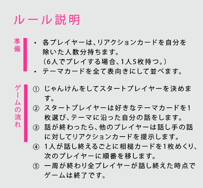 ②スタートプレイヤーは好きなテーマカードを1枚選び、テーマに沿った自分の話をします。